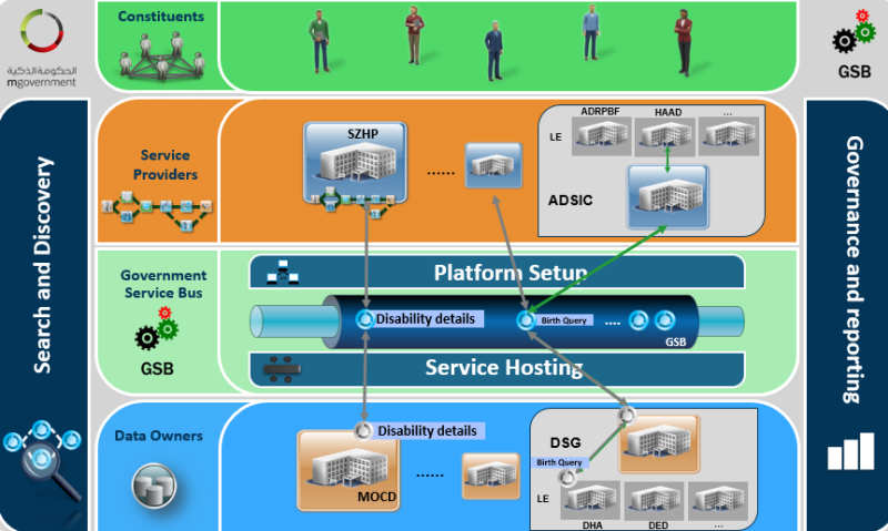 يندرج مشروع "الرابط الحكومي للخدمات " (GSB) ضمن مبادرات الحكومة الذكية، حيث يساعد الجهات الاتحادية والمحلية على تقديم خدماتها بشكل مترابط ومتكامل مع تبادل البيانات بانسيابية بين أنظمة تلك الجهات بما يخدم حاجة المتعامل في الحصول على خدمات الحكومة من دون الاضطرار للانتقال من جهة حكومية إلى أخرى.