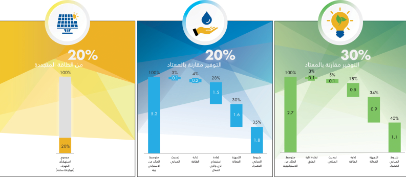 ستحقق الاستراتيجية ما يقارب توفير نسبة 30٪ في استهلاك الكهرباء، و 20٪ توفيرًا في استهلاك المياه ، و توليد 20٪ مساهمة من الطاقة المتجددة في مزيج الإمداد ، بالمقارنة مع سيناريو العمل المعتاد. تتماشى هذه الأهداف مع رؤية رأس الخيمة 2030، والتي تهدف إلى توفير 10٪ في الكهرباء، و 5٪ من الطلب على الكهرباء ليتم تلبيتها بواسطة الطاقة الشمسية بحلول عام 2030.