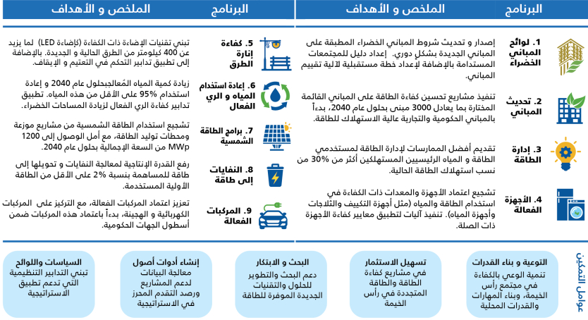 تساهم استراتيجية كفاءة الطاقة والبيئة في تحقيق أهداف مختلف الأجندات والخطط الاتحادية مثل الأجندة الوطنية لدولة الإمارات العربية المتحدة 2021، واستراتيجية الإمارات للطاقة 2050 ، والخطة الوطنية لتغير المناخ 2017 - 2050 على المستوى الاتحادي؛ ورؤية رأس الخيمة 2030 على المستوى المحلي.