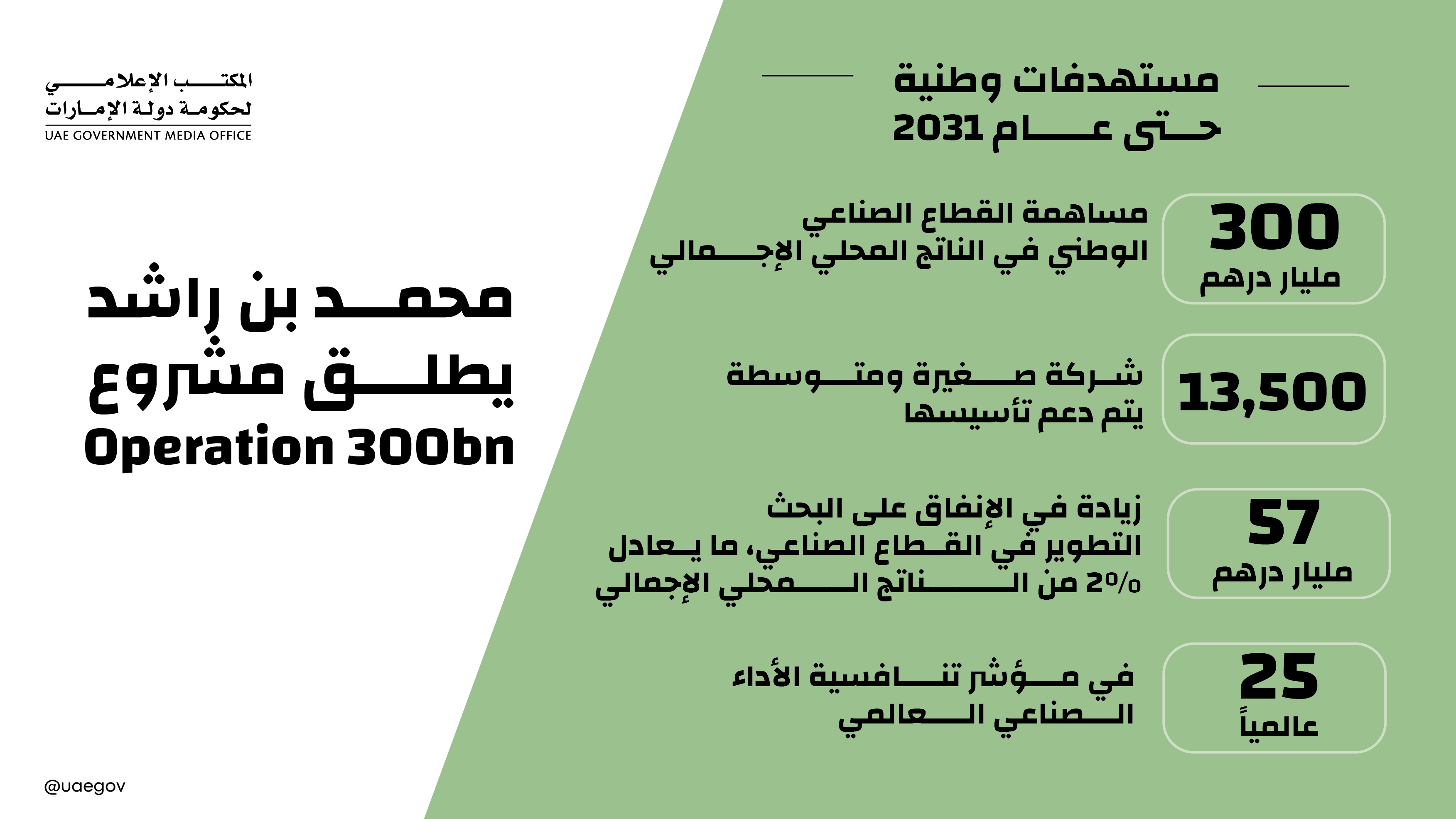 للحصول على أحدث المعلومات بشأن القطاع الصناعي في الدولة، يرجى زيارة الموقع الإلكتروني لوزارة الصناعة والتكنولوجيا المتقدمة.
