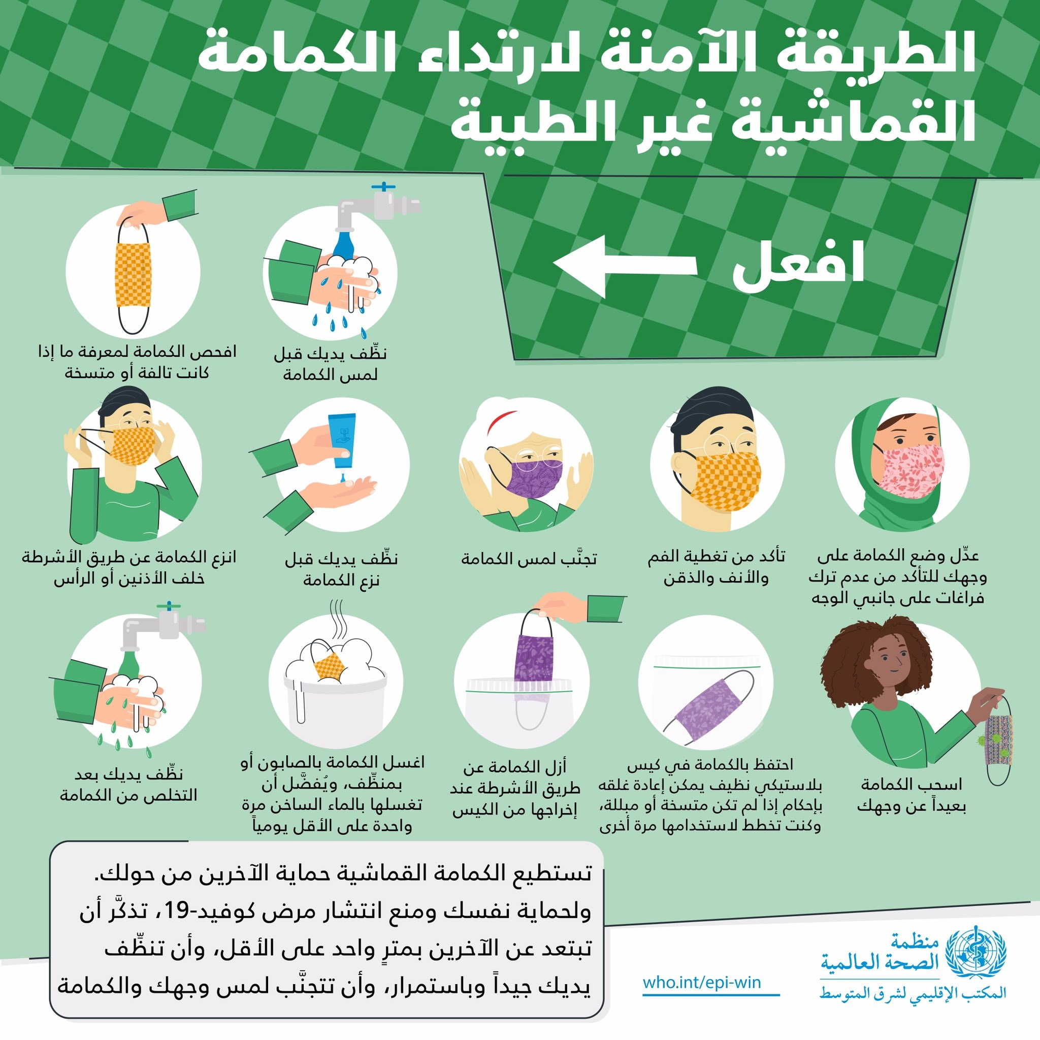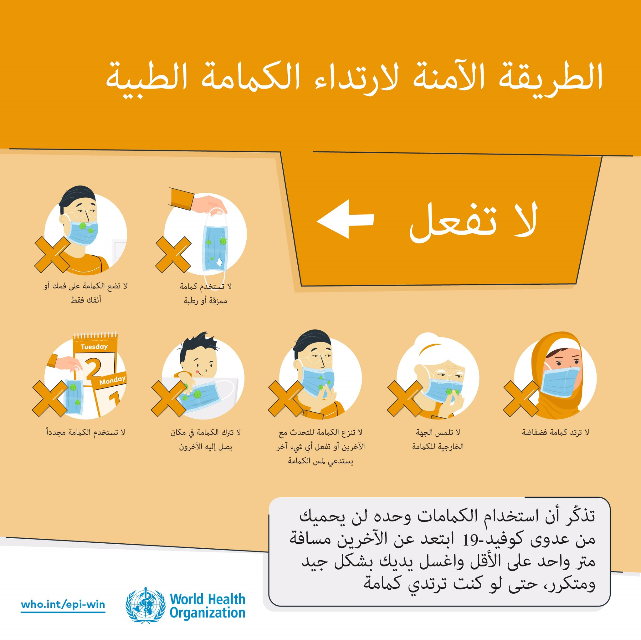طالع الإرشادات التالية الصادرة عن منظمة الصحة العالمية بشأن كيفية ارتداء الكمامات بشكل آمن. يرجى العلم أن ارتداء الكمامات وحده لا يقي من فيروس كورونا المستجد (كوفيد-19)، وأن حكومة دولة الإمارات تنصح بارتداء القفازات والحفاظ على التباعد الاجتماعي لمسافة مترين عن الآخرين وغسل اليدين بشكل متكرر لمدة 20 ثانية.