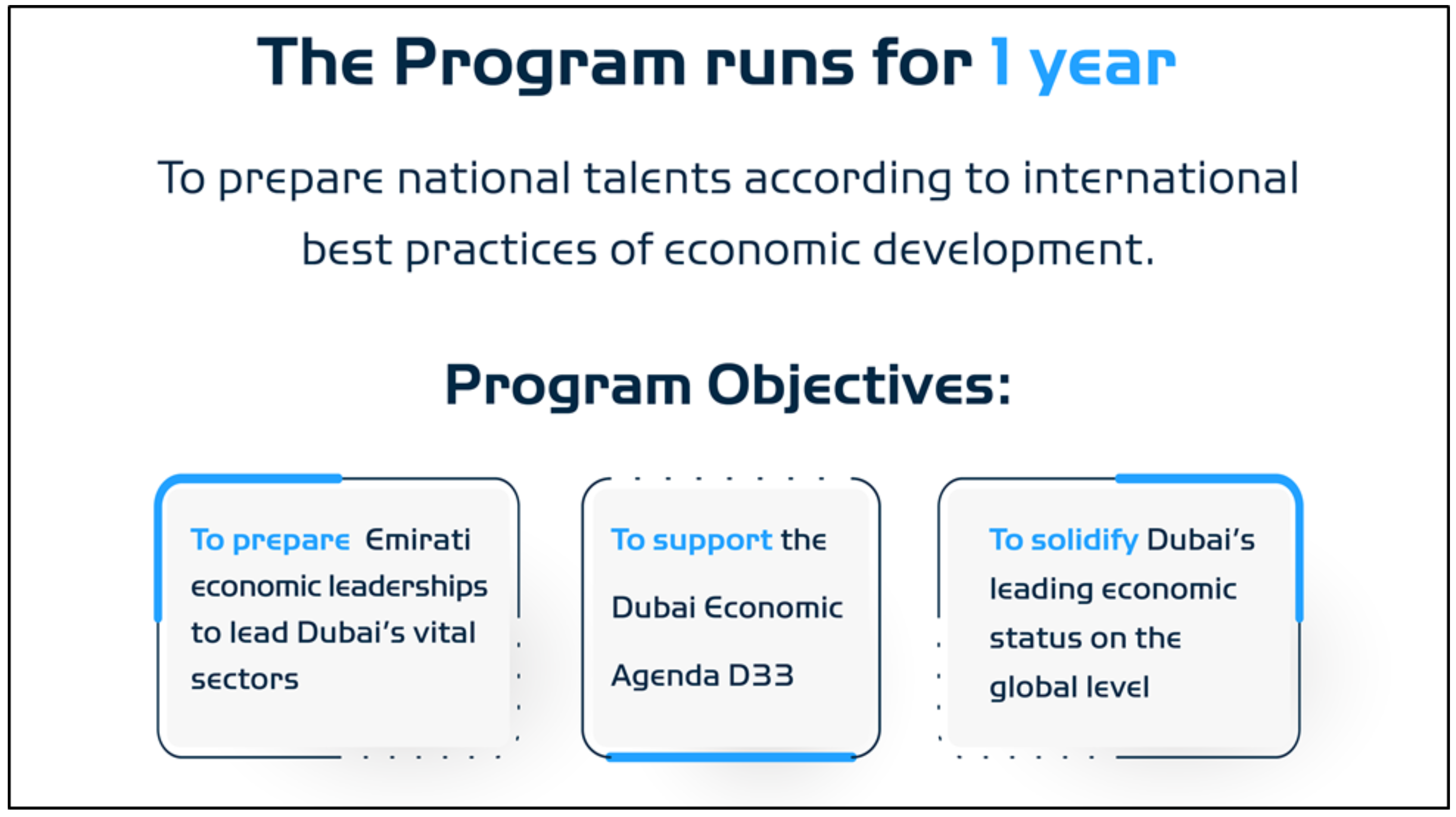 Dubai Economic Leadership Program aims to prepare the next generation of competent Emirati talents to lead Dubai’s vital sectors by enriching them with knowledge of the latest economic trends and expertise.