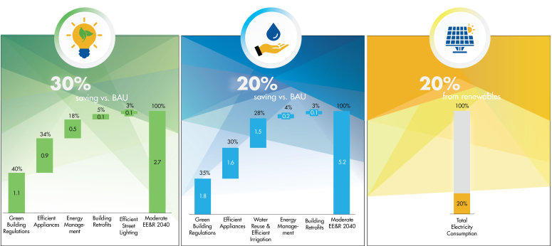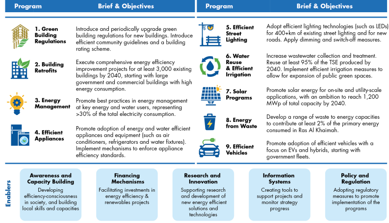 The EE&R Strategy contributes to the goals of various federal agendas and plans such as the UAE National Agenda Vision 2021, the UAE Energy Strategy 2050, and the National Climate Change Plan 2017 - 2050 at the federal level; and the Ras Al Khaimah Vision 2030 at the local level. From an international perspective, the EE&R Strategy represents an important aspect of Ras Al Khaimah’s contribution to the UAE’s commitments towards mitigation of climate change, following the Paris Agreement, and as part of the United Nations Framework Convention on Climate Change (UNFCCC) and supports 11 of the 17 Sustainable Development Goals of the UN.