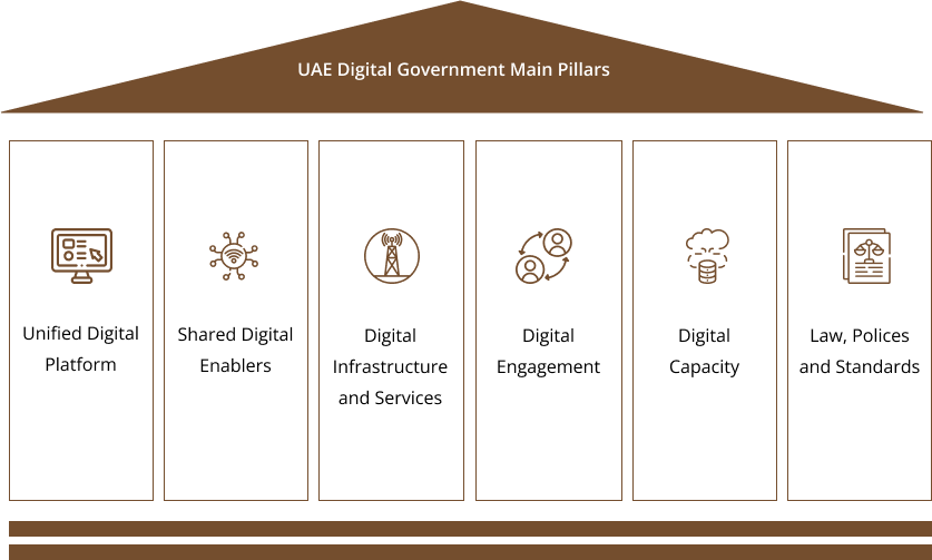The UAE’s National Digital Government Strategy is drafted on eight dimensions. The dimensions were aimed to leverage The OECD Digital Government Policy Framework and were tailored to fit the UAE’s developmental plan in the post pandemic era. The eight dimensions are:
