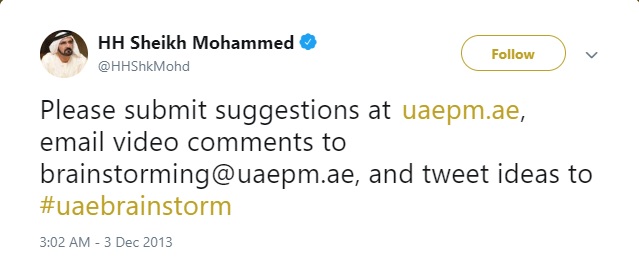 In December 2013, H. H. Sheikh Mohammed bin Rashid Al Maktoum, Vice-President and Prime Minister of the UAE and Ruler of Dubai, called upon the citizens to join the largest national brainstorming session to promote fresh thinking and innovation in generating ideas for developing the health and education sectors.